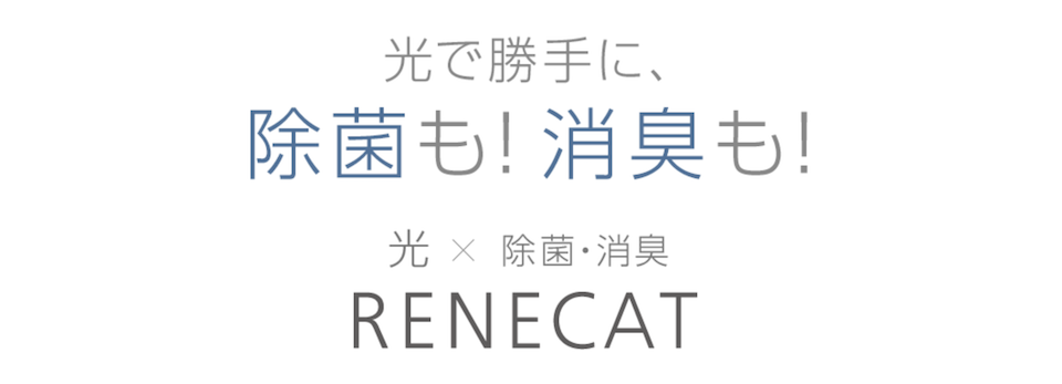 ルネキャットとは、東芝マテリアルが開発した、太陽光はもちろん、部屋のあかりでも臭いの元を分解、菌増殖やウイルス活動を抑制する光触媒です。